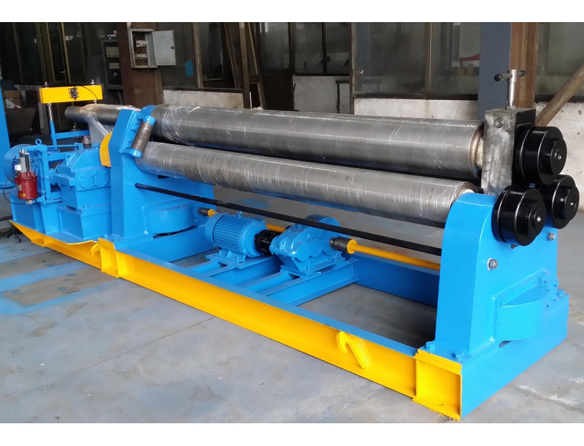 卷板機是將金屬板材卷彎成筒形、弧形或其它形狀工件的通用設備。三輥機械對稱式卷板機的下輥不能作水平移動,故工件端部的弧形必須經過預彎,預彎可在折彎機或廠方自制工裝完成。板料經兩端預彎后即開機卷筒。上輥升到板料可插進在三輥之間,插進板料后要注意板料兩側與輥子軸線的垂直性??稍谧灾频墓ぷ髋_上作一導尺保證板料的正確位置。一切檢查完畢后,壓下上輥開始作業,上輥點動,使板料作垂直方向微量位移,板料經一個行程后開始彎曲,此時使下輥反轉。再次點動上輥向下微量位移,這樣周而復始,不斷來回輾轉直至筒口閉合。停車,升起上輥,壓下上輥尾端使上輥微微抬起,拔下翻倒座插銷,拉下翻倒座,制品即可從機上取下。
