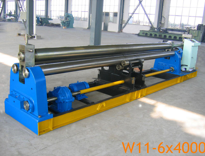 W11-60X4000機械對稱式三輥卷板機是全機械式三彎板機。 三個滾筒全部固定,像金字塔一樣放置。